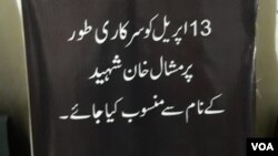 دوی يوه غوښتنه دا هم کړې چې "۱۳م اپرېل دې په سرکاري توګه د مشال خان په نوم کړی شي".